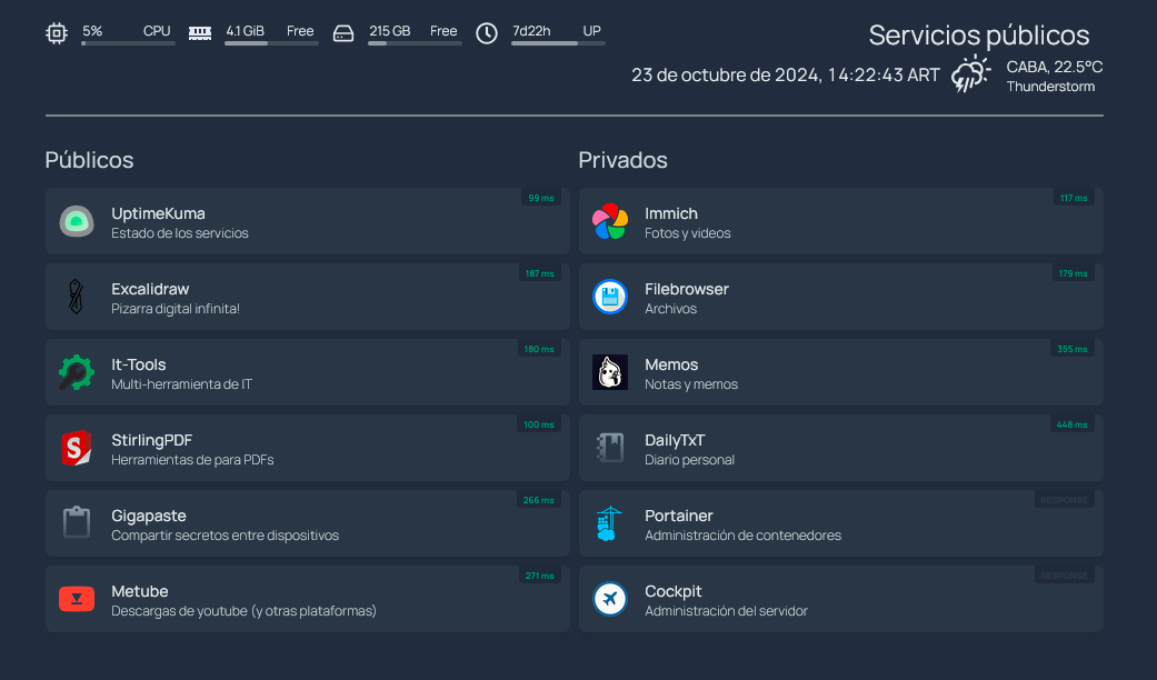 Homepage es la página de inicio para todos los servicios disponibles en Prophet.bar. Aquí podremos visualizar el estado general del servidor y sus servicios. También nos provee un acceso directo a todos los servicios que se encuentran disponibles.