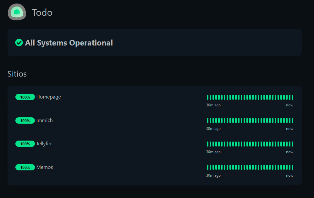 UptimeKuma es un servicio para monitorear el estado de diferentes servicios y dispositivos. Aquí podrán ver si todos los sistemas se encuentran funcionando correctamente. En caso de tener problemas para acceder a alguno de nuestros servicios usted puede consultar este sitio para verificar si su problema es generalizado o si se trata de un problema individual.
